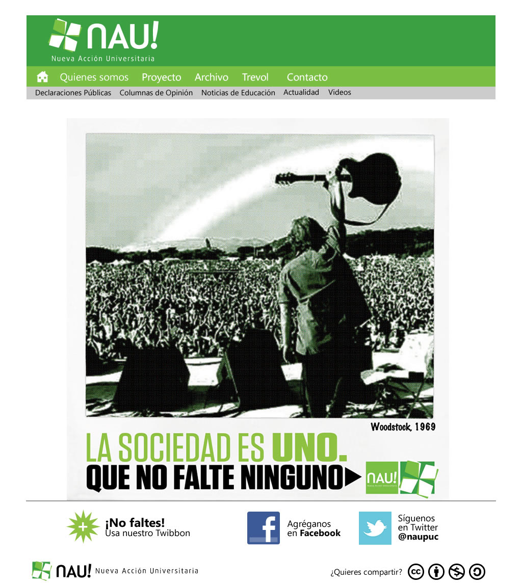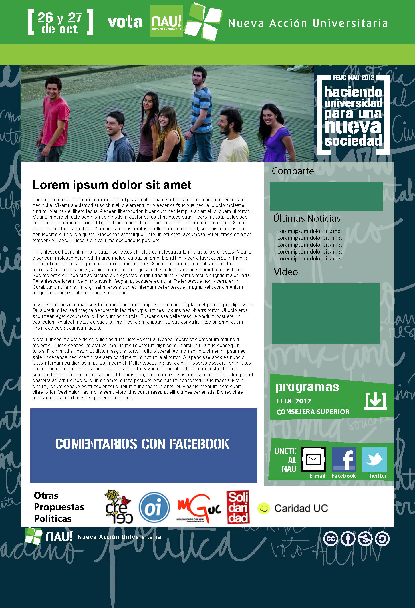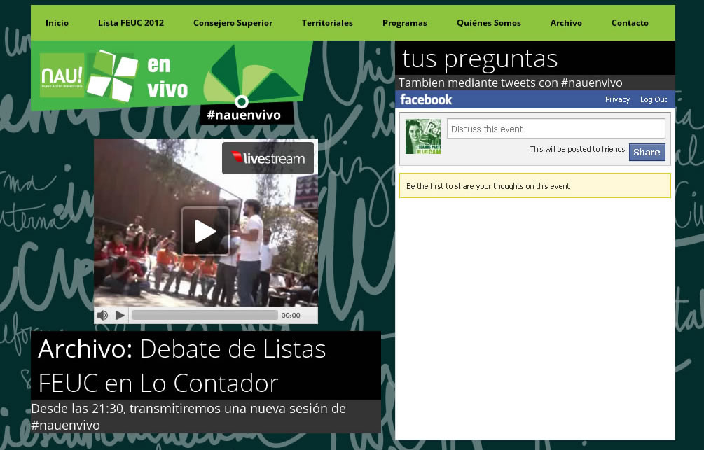 Programación de sitio web para la campaña FEUC 2012 de la Nueva Acción Universitaria, movimiento político de estudiantes de la Pontificia Universidad Católica de Chile. El sitio fue desarrollado en WordPress a partir de las piezas gráficas realizadas por el equipo de diseño de campaña.